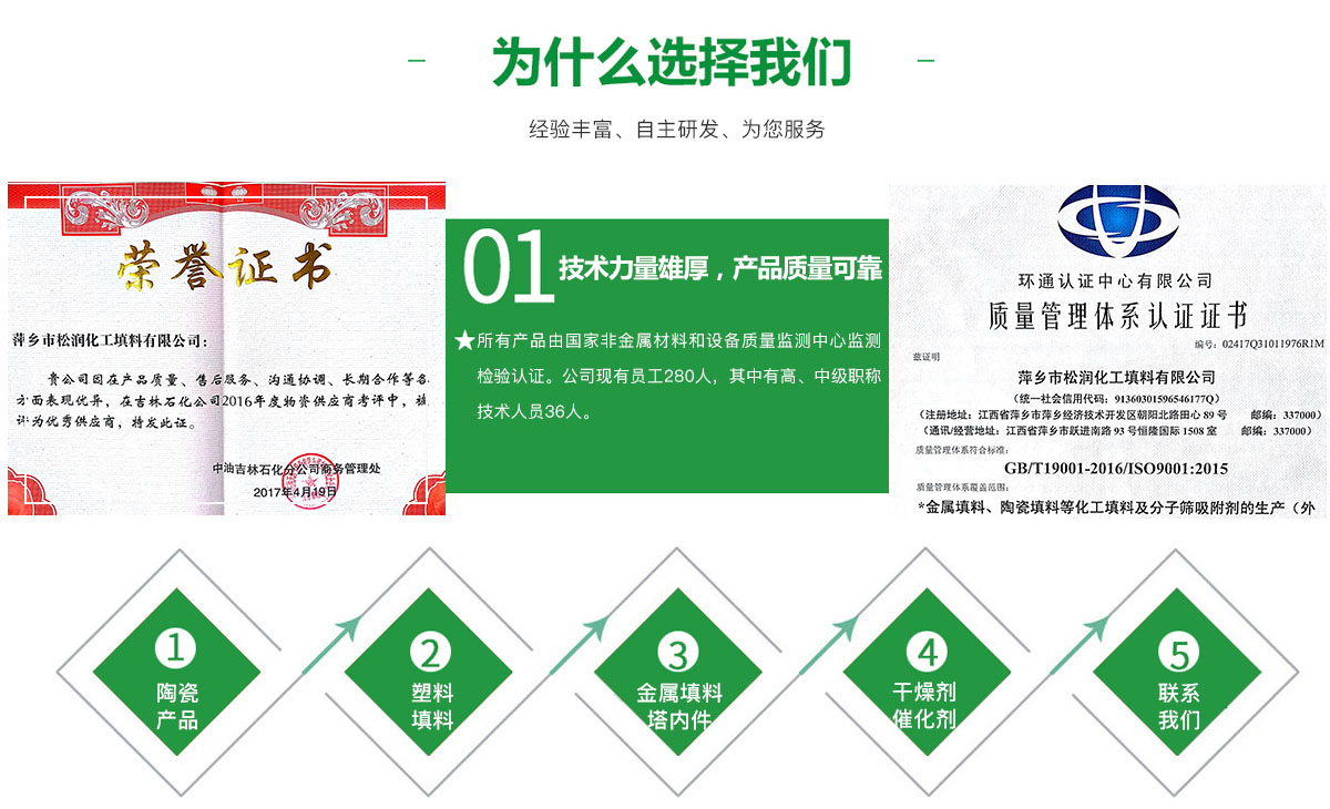 萍鄉市松潤化工填料有限公司位于江西省萍鄉市國家經濟開發區西區,是專業生產、經營陶瓷、聚丙烯、金屬填料、塔內件、水處理濾板、濾管、濾料、瓷球、分子篩、催化劑、活性炭、蜂窩陶瓷、瓷質耐磨托輥等系列產品的民營企業。所有產品由國家非金屬材料和設備質量監測中心監測檢驗認證。公司現有員工280人,其中有高、中級職稱技術人員36人。工藝先進,技術力量雄厚,產品質量可靠,配...